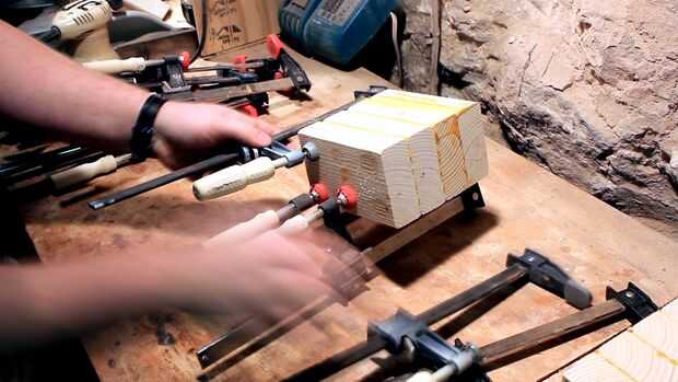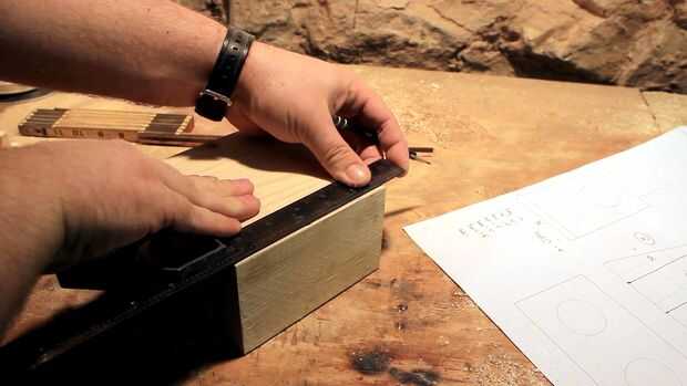 El cuerpo se crea de manera muy similar a través de la laminación 4 piezas, esta vez a poco más de 4-1/2" de longitud aproximada. La forma del cuerpo es bastante sencilla, tan sólo medir y trazar las líneas en el cuerpo. Corte hasta el espesor correcto y desprender las esquinas para crear la forma del cuerpo.