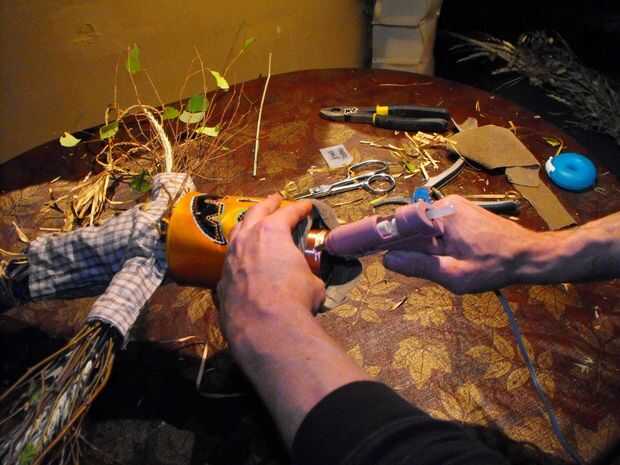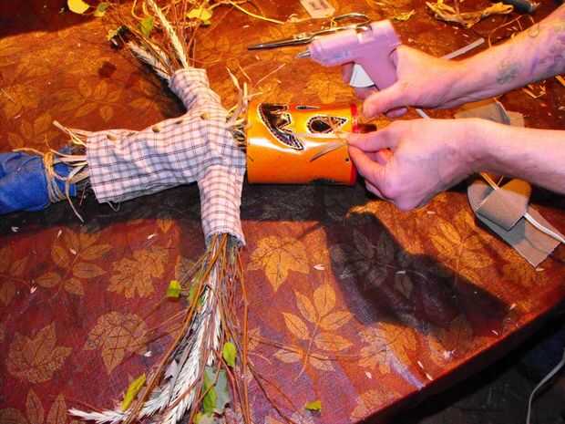 Crear ropa y sombrero de telas de desecho y caliente pegar en el cuerpo de la ramita