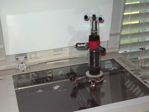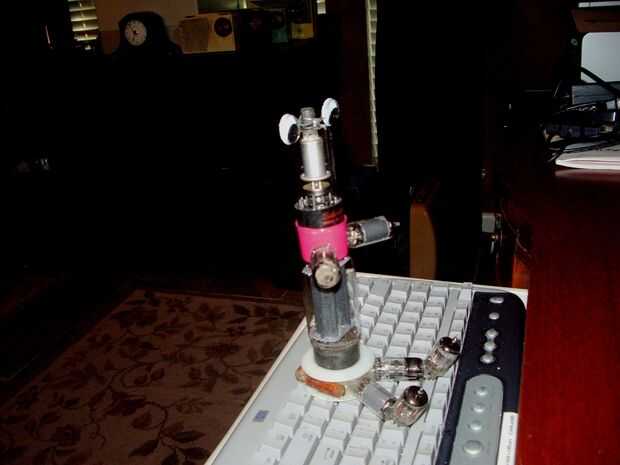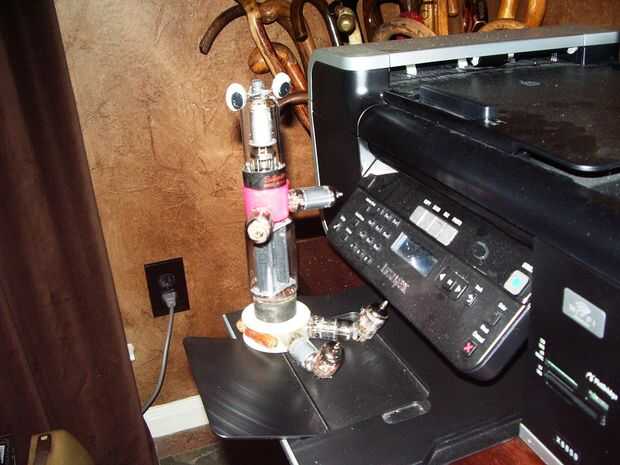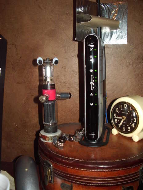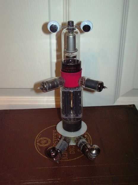 Se compone de 8 tubos de vacío de un televisor antiguo, plástico bamboleo ojos de una tienda de artesanía, un casquillo de un WD-40 puede, un carrete de alambre de plástico vacía y montones y montones de pegamento caliente.