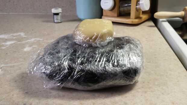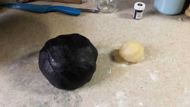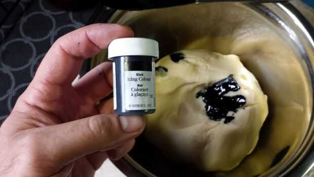 Añadir 1 cucharadita de comida negro colorante para el resto de la masa y amasar otra vez hasta que el negro es uniforme