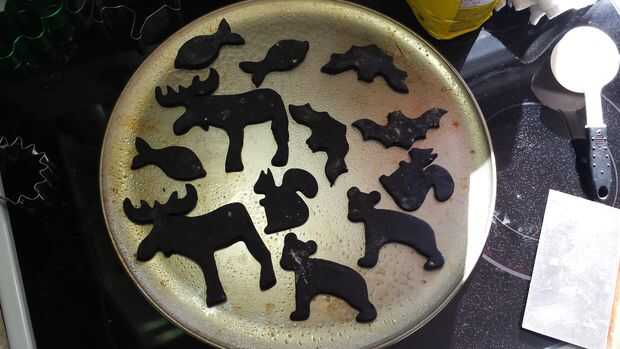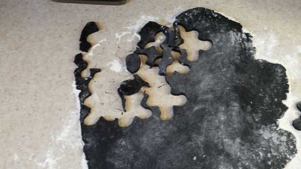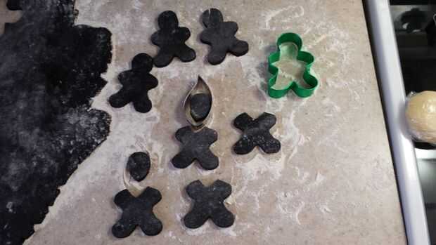 En este punto no necesita la masa blanca enseguida así que déjalo Chillin '. Sacar el negro uno y rodar hacia fuera en la encimera enharinada a 1/4 de pulgada de grosor y hacer primero tus hombres delgados (hecho 7 pero podría haber hecho 10 con la masa blanca dejar a un lado) hacer bichos con el resto de la masa enrollada hacia fuera. Cortar las cabezas de los hombres (utiliza un cortador de la hoja y hace un recorte de v. en el cuerpo de la suite).