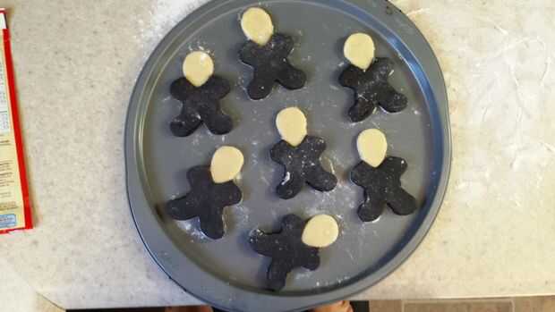 Estirar la masa blanca un poco más delgado cerca de 3/16 de una pulgada y corte la parte superior de los hombres (el revés de lo que hiciste para los negros). Únete a los blancos con los negros :) y dejarlos enfriar un poco.