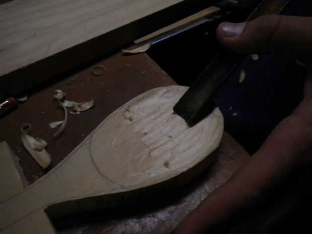 Cuando comenzar con el cincel hace una ranura profunda para marcar la profundidad a cincel el resto. Asegúrese de que ir con el grano para no arruinar la textura de la cuchara. También asegúrese de que no vas a cerca de la orilla o se le sopla hacia fuera el lado.