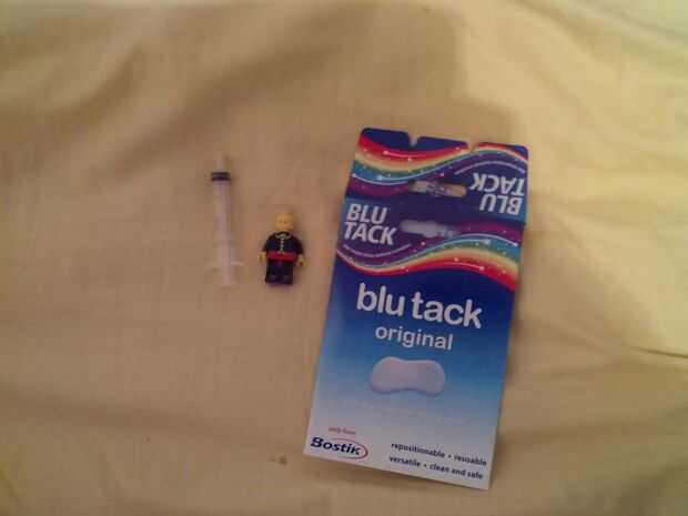 Hombre de Lego, jeringa limpia (Haz que de los médicos) y algunos blu tack (blue tack como yo lo llamo).