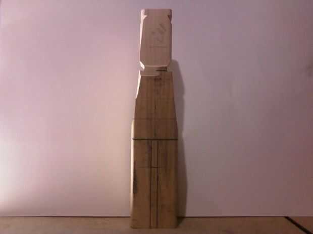 Mi 1 º intento no tuvo éxito porque era demasiado alto y sólo tallada en un solo bloque de madera. Pronto me di cuenta de que, (1) tenía que ser más corto en altura y (2) tienen sus características de componentes por separado. Luego procedí a cortar los elementos individuales para él de un largo de 3 1/2 pulgada de alto por 3 1/2 pulgada ancho bloque de pino.