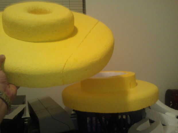 terminé comprando 12-1 1/2" x 24' x 60" hojas de espuma de poliestireno. No pude encontrar unos más gruesos que eran asequibles. Por lo tanto, terminé pegando estas hojas grandes con algún pegamento gorila (poco va un largo camino). Una vez secos estos, que trazado / trazado de las dimensiones para los pies (la parte superior de las patas se acercó a mi rodilla (lateral Nota - soy 5'11 ")). Entonces yo cortar los 2 círculos para la parte superior e inferior de la cabeza como se muestra en la foto. También cortar 2 círculos más pequeños. Uno para la parte superior para reflejar la clavija de Lego. Y uno un poco más grande para la parte inferior así que pude corte un agujero lo suficientemente grande como para que deslice sobre mi cabeza sin mucha fricción.