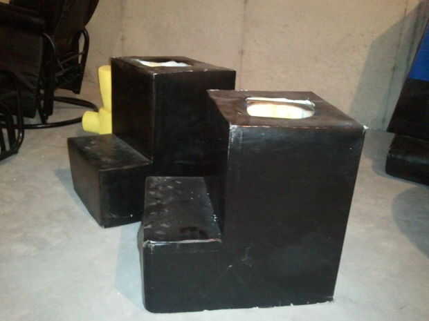 Los pies - corte de espuma de poliestireno, formas L 4 (2 por pie, 1 para cada lado). Luego pega sólo trozos pequeños de espuma de poliestireno en forma de cada pie. Una vez seco el pegamento, los cubrí con el tablero de cartón y carteles. Luego aplicar alguna pintura negra. Un tema que encontré estaba tratando de averiguar una forma para que mis pies al entrar y salir con facilidad. Necesito también estos falsos pies para moverse mientras camino. Así que lo que hice fue, puse mi pie en el falso pie y averiguado donde la parte superior de mi pie y pegados algunos más espuma de poliestireno para rodear mi pie. Realmente siento que puede haber una mejor manera de hacer esto.