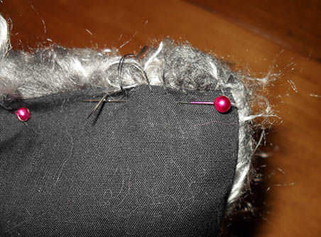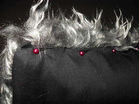 El rodillo los bordes de la piel y algodón hacia adentro y pin. Si usted no trabaja con la piel a menudo pueden tomar varios intentos para obtener el cuelgue de ella. Puntada de la mano para cerrar con un hilo de rosca de acoplamiento. Pellizque a sus tejidos juntos como vas a asegurar que realmente está agarrando a la tela base de la piel con la aguja, no sólo tejer el hilo hacia adelante y hacia atrás a través de los pelos.