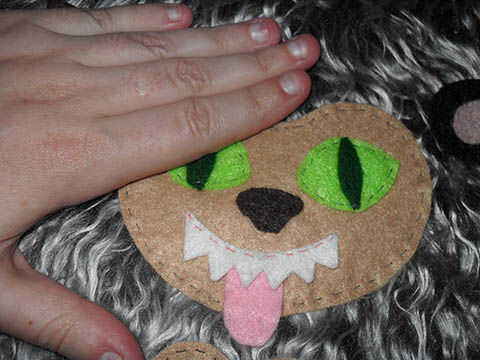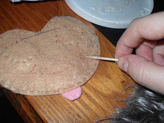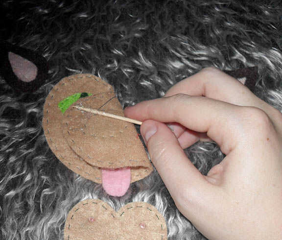 Cuando nos atenemos a sus piezas a la piel, presione firmemente hacia abajo. Permitir un tiempo secar antes de pasar al siguiente paso. Al aplicar las piezas de fieltro, no limpie las manos en el fieltro en un movimiento de barrido. Hacerlo puede causar las piezas hacia donde no queremos y conseguir goo pegamento en parte os la piel de que no tenía intención.