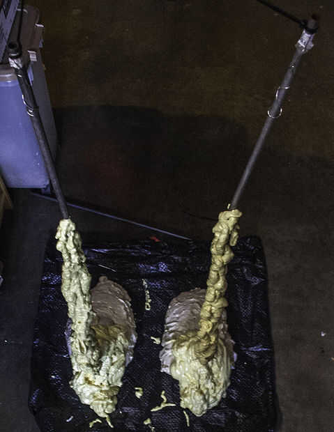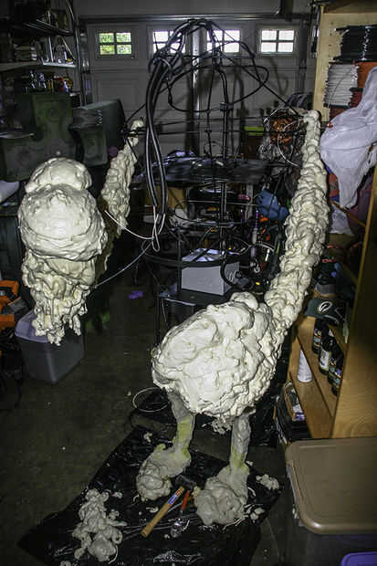 Una vez que la eléctrica estaba completada comenzó el proceso que hace espuma. Usando espuma enlatada regular de cualquier tienda de mejoras para el hogar o ferreterías. Cuanto más densa la espuma la mejor, demasiado ligera o "luminosas" no es una buena espuma para esculpir. Desea que un duro de la espuma pero no tan fuerte que es difícil de modelar. Espuma tiene que ser hecho en capas, paciencia va a ser tu amigo!! Demasiado demasiado rápido y apenas se caen! Demasiado espesa demasiado rápido y la espuma no configurará correctamente. Este material es desagradable, si cualquier caídas sobre cualquier superficie, dejar solo y que ha establecido. Una vez que se instala usualmente solo pop, si tratas de limpiar antes de que establece te tendrá un serio lío en sus manos. WD40 es lo único que sé de eso disuelve esto cosas cuando está todavía en el estado fresco.