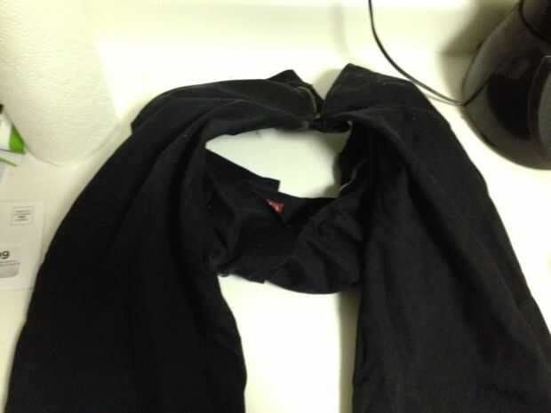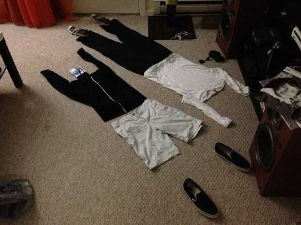 2: seleccioné pantalón negro para ir sobre mi torso y brazos para que pudiera usar algo negro sobre mi cabeza para hacerla mezcla mejor (que ya estaba de noche). Elegí una camisa blanca de manga larga para usar sobre mi cintura y las piernas porque ayudó a llamar la atención de mi parte superior del cuerpo donde estaba tratando de ocultar mi cabeza. Funcionó de maravillas y las mangas largas cubrieron casi por completo mis piernas, de esta manera mis piernas realmente parecían brazos si seguí recto.