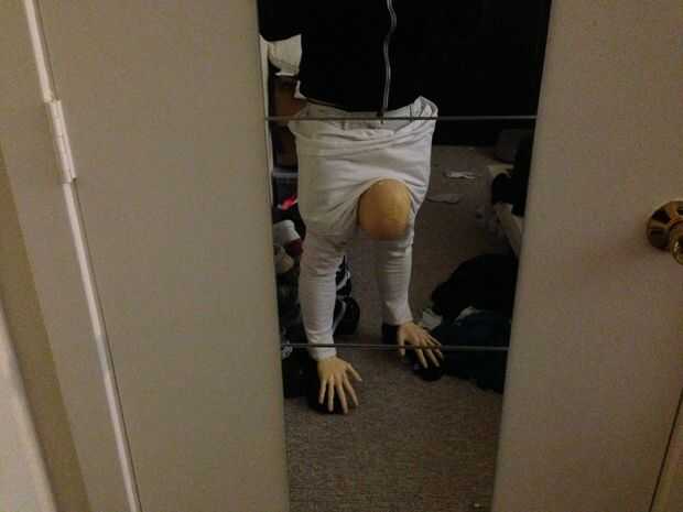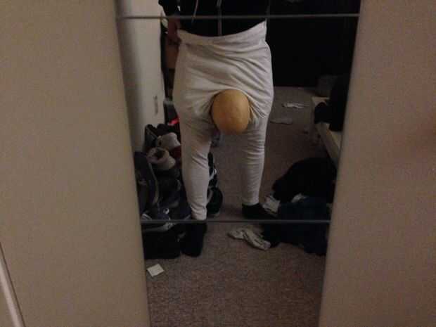 Como que estaba explicando antes, el truco para tirar de la ilusión es anatómicamente correcta y atraer la atención de donde intenta ocultar su cabeza. Para distraer de la cabeza, usar colores oscuros en los cabeza y brillantes colores en todas partes. Para ser anatómicamente correcto, sólo mirar una foto de una persona hacer un handstand y observe qué dirección todo está enfrentando. No hay manera que usted podría tener zapatos mirando hacia atrás pero una cabeza frente remite.