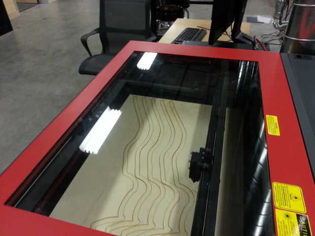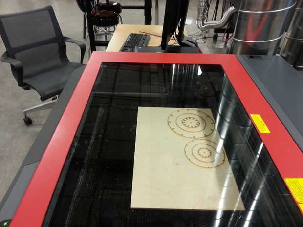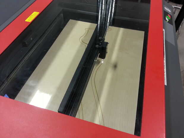 Con el archivo completado en mano, la siguiente parte es fácil. Cargar la cama láser con madera y pulse play. Entonces la mirada de asombro a la maravilla de precisión CNC. Si estás haciendo esto en la Sierra de la venda en una tienda de 90 grados, lo siento. No me refiero a regodearse. Utilizar herramientas reales para cada build más 24 x 18" que es casi todo.