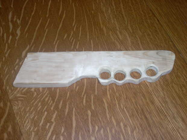 Después llevé la Junta interior colocó mis dedos en él de la manera que sostendría. Entonces saqué alrededor de cada uno de mis dedos. Entonces tomé una broca de 3/4 pulg y taladrar cada agujero asegurándose de que hubo por lo menos 1/4 de pulgada alrededor de cada agujero para no romper.