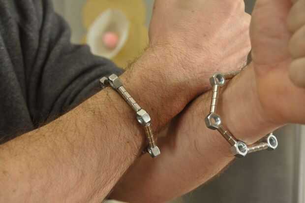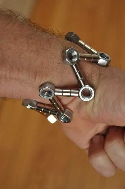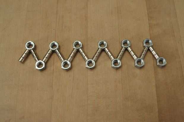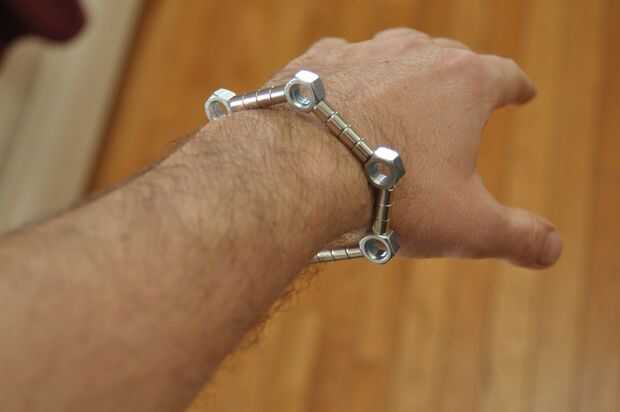 Yo jugaba con las tuercas y los imanes y encontró que uniformemente espaciado hacia fuera hacen una pulsera de la muñeca bonita, aspecto masculino. Además, duplicando las tuercas y los imanes me deja hacer un patrón de zig-zag.