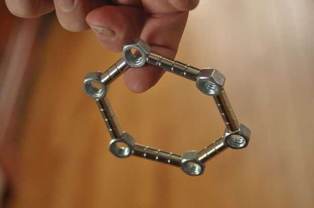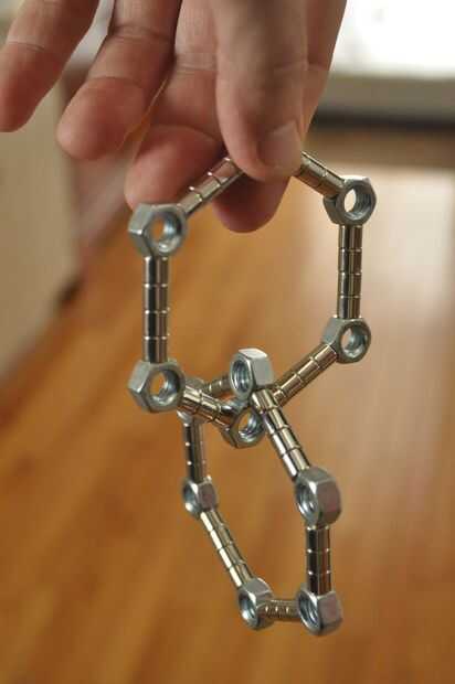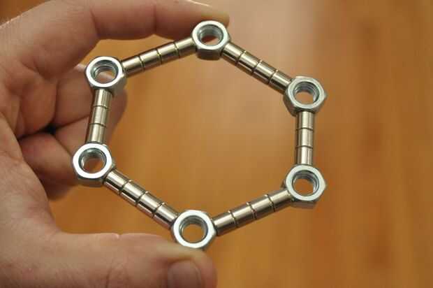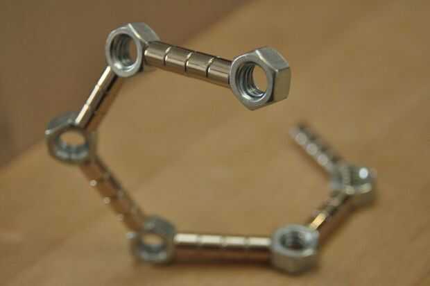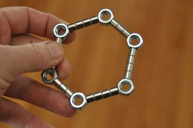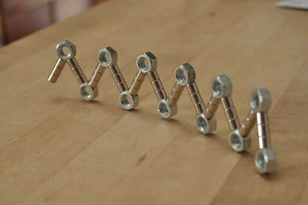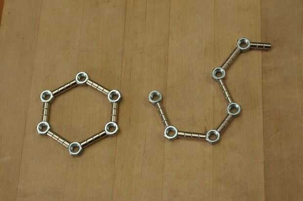 La principal razón no es porque los imanes como para sí mismos la línea recta. Así que, cogí una caja de tuercas 5/16", desde el garaje. tuercas de 6 lados le permiten hacer 60 grados y los ángulos de 120 grados, perfecto para triángulos y hexágonos.