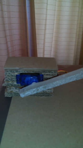 Justo debajo de 'cuello', de pedazos de cartón construido un soporte para mi servo. Por supuesto esto se puede hacer con un ángulo de hierro (o plástico), pero que es un poco duro conectar al torso de cartón, así que sólo usé cartulina para el servo. Agregué un brazo al servo de una 11 x 0,6 x 0,6 pieza de plástico de la tabla de picar y al que te serva. Otra vez, mira las fotos para ver cómo se hace