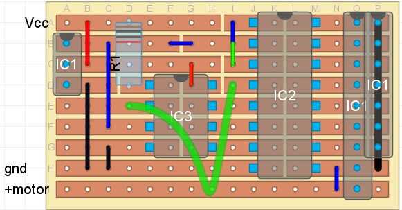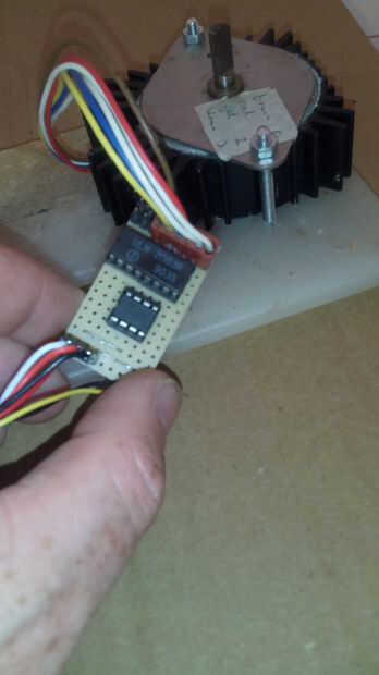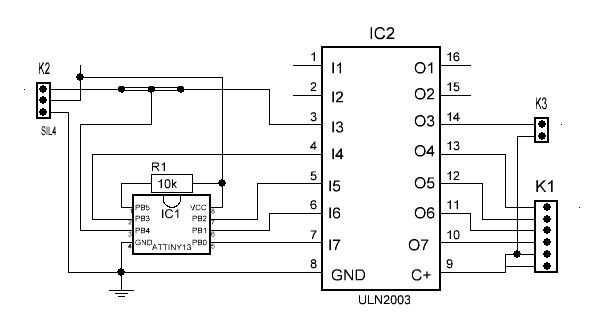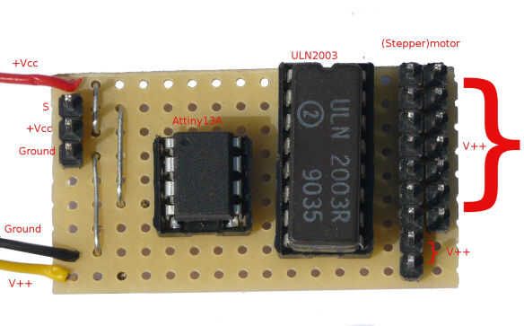 El controlador es un Attiny13, unido a un ULN2003. Aunque en mi versión he utilizado clavijas un poco más para hacer más flexible para otros proyectos de la Junta, las cabeceras sólo que necesita son un encabezado de servo macho de 3 pines y un encabezado macho de 6 pines para el paso a paso