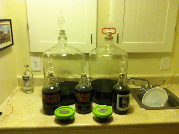 Nota sobre espirales roble y bombonas. Lamentablemente espirales tienen un diámetro similar como el cuello de la Damajuana. Fáciles de conseguir en pero difícil salir. En la retrospección deseo que me hubiera roto más para que sea más fácil de quitar. Y semillas de coco son sólo del tamaño correcto para bloquear su bastón de mando. Puede ser beneficioso colocar a las semillas de coco en una bolsita de té, filtro de café, o triture más para evitar esto.