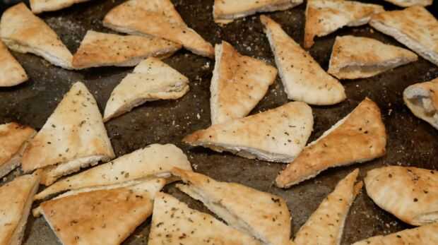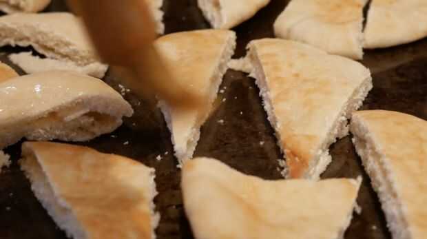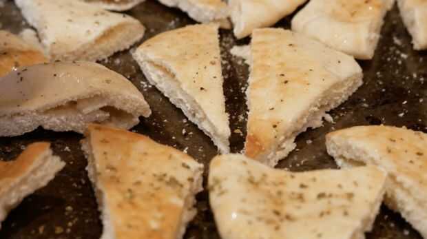 Cortar el pan de pita en triángulos pequeños y coloque en una bandeja de horno engrasada. Cepillo y temporada de cada lado de la pita pan con aceite de oliva, sal, pimienta y hierbas mezcladas. Hornear a 200 grados C/392 grados F durante 10 minutos (entregar los chips de pita en el punto 5 minutos)