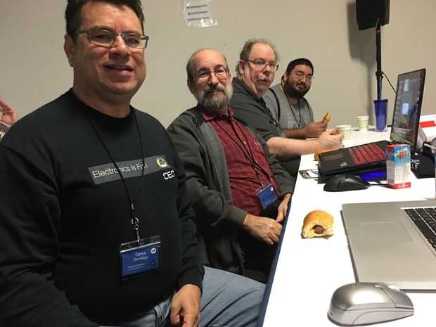 Ya que iba a ser en el área de Austin, TX para el cumpleaños de mi hija, me invitaron a unirse a mis amigos para el Roadshow de Intel-IoT y Hack-a-thon, con el desarrollo de Intel Edison Kit. Los criterios del concurso era utilizar un Intel Edison y bosque protector kit de forma práctica y útil. Empezamos con un concepto de la construcción de una consola para grabar sonidos y enviarlas al usuario en un mensaje que luego podríamos jugar consiguió ampliado en lecturas de medio ambiente de la habitación. La discusión se encendió parecía más práctico que en lugar de colocar sensores en cada habitación, debemos enviar una plataforma de sensores alrededor de la casa (o lugar de trabajo) para visitar y recopilar datos de cada lugar designado. Por lo tanto, el nacimiento de la Home Sentry Robot Project y la RoboDorks: (en la foto arriba, de izquierda a derecha) Carlos Santiago, Obe Rienhardt, Davld Fowler y Daniel Fowler.