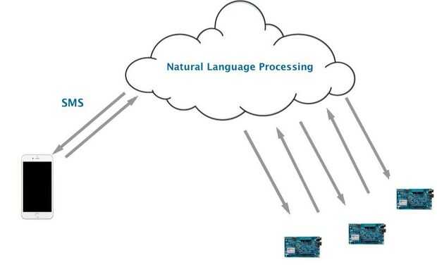 Los mensajes de texto con preguntas enviadas desde el teléfono se analizan con algoritmo de procesamiento del lenguaje Natural y devolución un mensaje de texto al remitente según el contexto por ejemplo en la temperatura, luminosidad, etc..