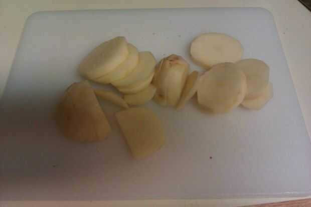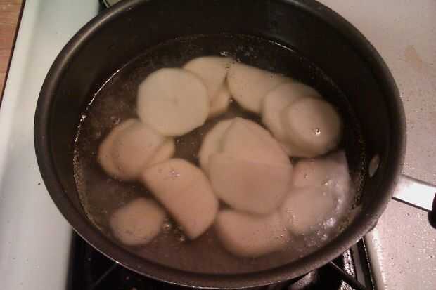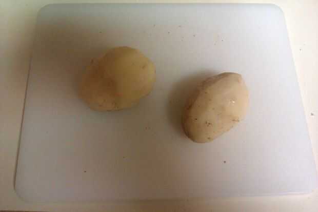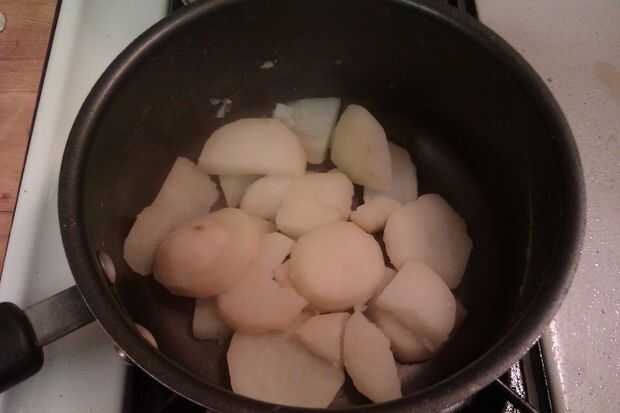 Esta receta aproximadamente 1/2-1 taza de puré de patatas sin sazonar. Para ello, tomar una o dos papas más bien pequeños, cáscara y rebanada y hervir hasta que se suavicen lo suficiente como para romperse fácilmente con una cuchara. Drenaje del agua y puré.