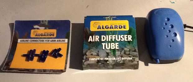 > 1 x bomba de aire acuario sin marca, incluyendo aerolíneas de silicona de 3 m, antirretorno válvula y difusor piedra (ebay en gastos de envío de £5 inc).