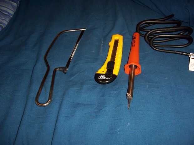 Otro equipo que se necesita. Yo optó por hacer un trabajo bastante ordenado y utilicé un soldador, arco de sierra y un cuchillo. Para el cuerpo del interruptor usé una vieja conexión scart como ya tenía las tomas de recepción para los phonos en mi cable. Para controlar el mando a distancia he utilizado el sistema de interruptor de apagado de una licuadora vieja que teníamos en el armario de la cocina!