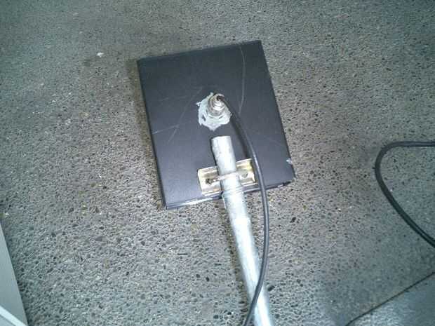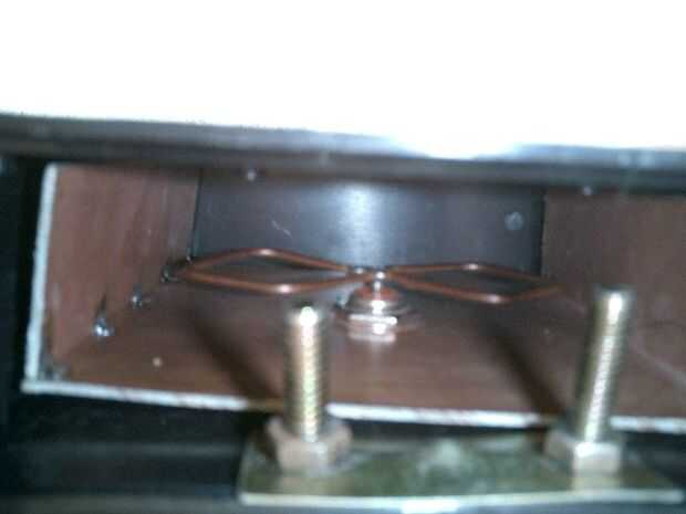 La segunda foto es una ojeada de mi Bi-Quad dentro de la caja de plástico. Se puede ver la placa de cobre revestida o PCB utilizado como reflector y alambre de cobre para el elemento principal.