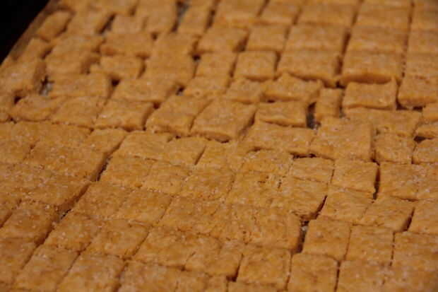 Transferir sus hojas delgadas de masa sobre la bandeja y luego cortar en cuadraditos con un cuchillo, cortador de pizza, rueda de pastelería o cualquier otra cosa que le apetece.