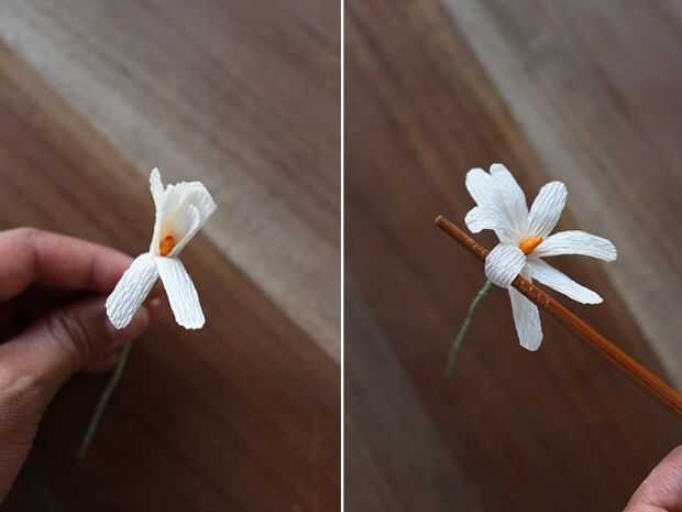 Luego en abanico los pétalos, uno a la vez. Doble o enrollamiento sobre un palillo o un lápiz.