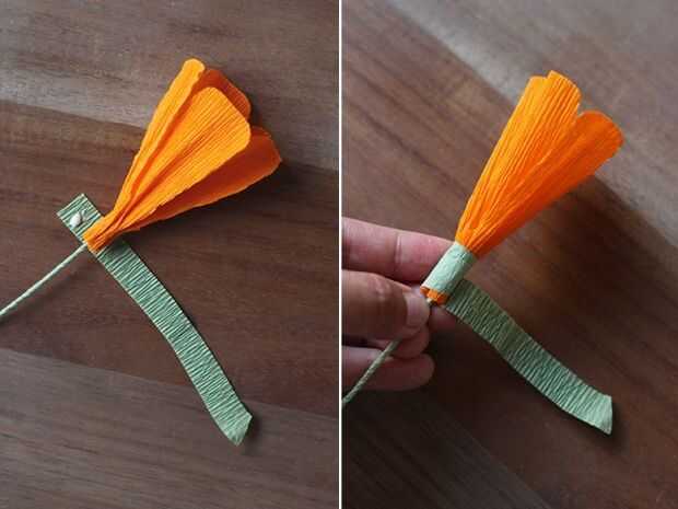 Añadir una tira de papel crepé verde alrededor de la base de la flor –, envolver y jalando hacia abajo.