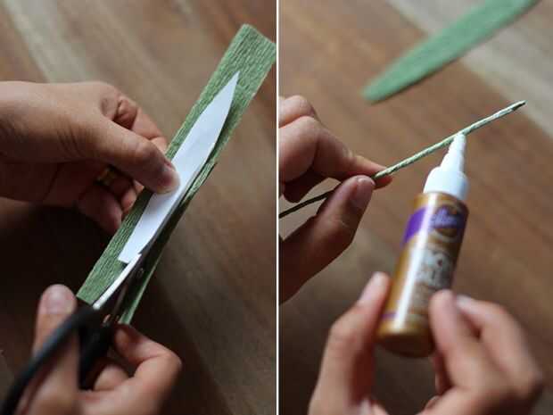papel. Recuerde alinear los patrones pétalo a lo largo, a lo largo del grano del papel crepe. Ejecutar una línea de pegamento a lo largo de la parte superior del tallo.