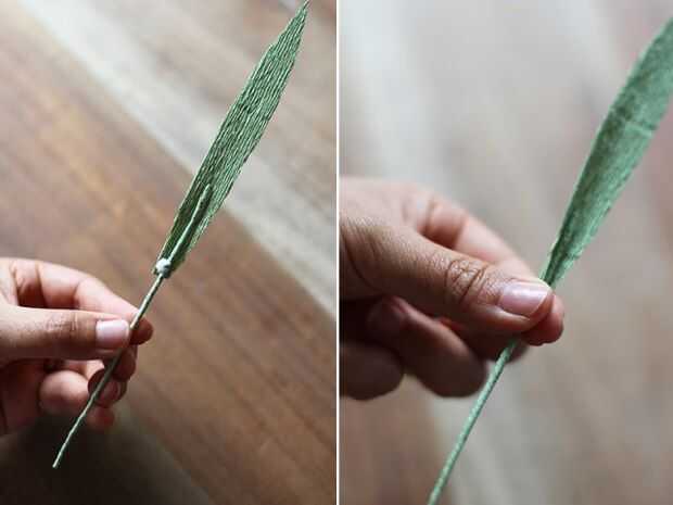 Colóquelo en la parte inferior de la hoja. Poner otra pestaña pequeña de pegamento en la base de la hoja y rodarla entre los dedos.