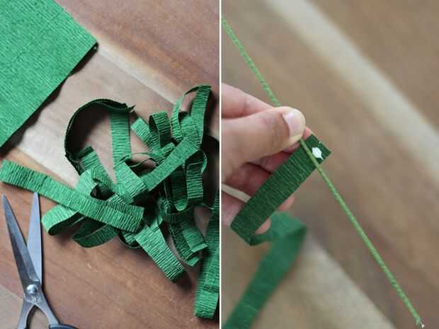Cortar varias hebras de 1/2 pulgadas de papel crepé verde obscuro. Pegamento y envolver uno