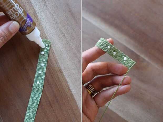Aplicar las gotas más pequeñas de pegamento pegajoso en una tira y empezar a envolver alrededor de la parte superior del alambre.