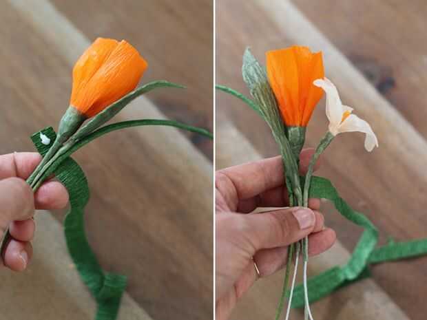 Centro de la U en forma de alambre con una tira de papel crepé. Asegúrese de que las flores estén orientadas hacia el centro de la forma de U. Seguir añadiendo más flores que trabaja por el alambre, envolviéndolos en el camino.
