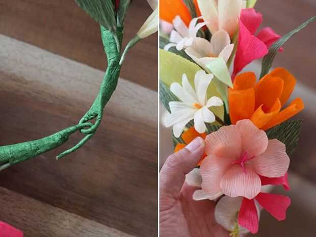 cable. Su corona tiene ahora su propio encierro! Volver y doblar las flores hacia afuera desde el centro y ajustar las hojas.