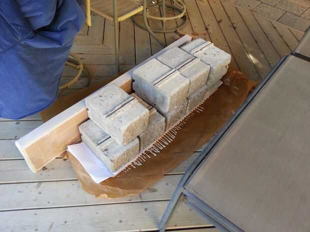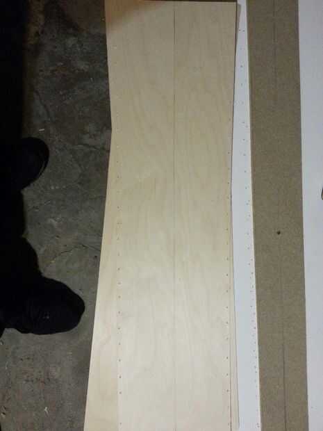 Segunda imagen: Este fue realmente mi tercer longboard. Yo no quería cualquier concavidad o curvatura para este juego de cartas (es decir, que quería una cubierta totalmente plana). Puse el papel cera sobre el terreno, puso mi cubierta en blanco en la parte superior, luego coloca todos los ladrillos concreto que pude encontrar ahí en mi casa encima de todo.