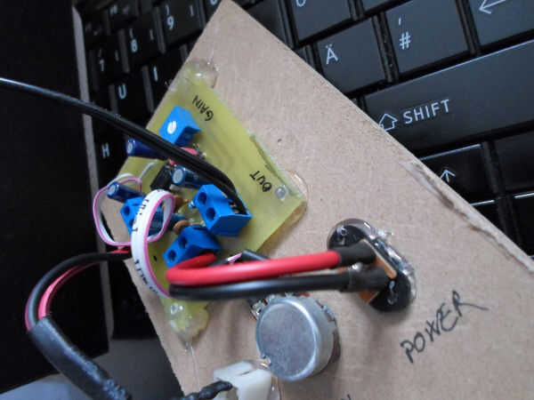 Me tomó algún tiempo para abrir la parte posterior del altavoz, pero después que he cortado corto el cable de audio del interior altavoz y yo hemos perforado unos agujeros para el enchufe, potenciómetro de volumen y conector de entrada audio. Todo lo fija en su lugar con pegamento caliente, he hice todos los cables y eso es todo.