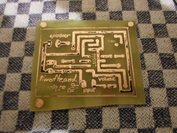 Después del baño de cloruro feric, perforación, soldadura y pruebas, que he encontrado en mi pelo con cosas viejas, un pequeño Altavoz de un sistema de sonido 2.1 tenía alrededor por un rato y yo pensamos que esta es una caja perfecta para el circuito del amplificador.