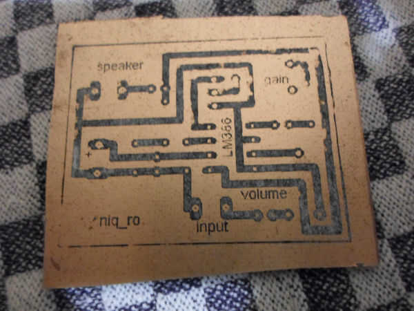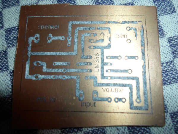 He impreso el esquema en una hoja de etiquetas de papel que es un poco brillante y como ya sabes, papel satinado es mejor hacer PCBs utilizando el método de transferencia de calor. He utilizado una plancha caliente para transferir el esquema del papel sobre un trozo de tablero recubierto de cobre limpia, pero porque estaba ansioso por ver los resultados, la transferencia no. Esto no es un gran problema para mi cuando tengo un marcador permanente alrededor porque tengo una mano muy firme cuando tengo que dibujar algo.