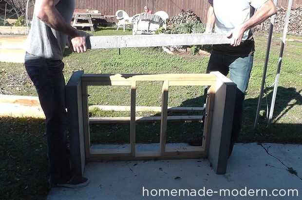 Levante la losa superior en su lugar. La losa es muy pesada, así que cuidado con romper los dedos entre las losas. Recomiendo usar al menos 4 personas fuertes para levantar la losa en su lugar y guía de los pernos a través de los agujeros en la pared de apoyo.