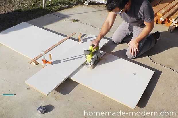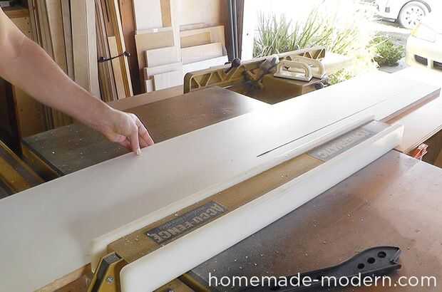 corté 3 1/2" ancho tiras de tablero de la melamina para usar como los lados de los moldes. Si haces esto con una sierra circular, sujete una regla a la Junta para servir como una guía. Una sierra de mesa hace este paso un poco más fácil.