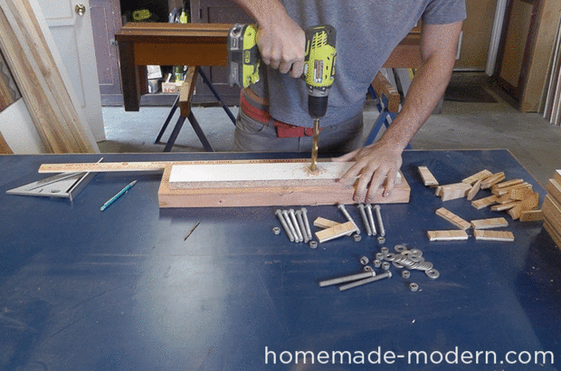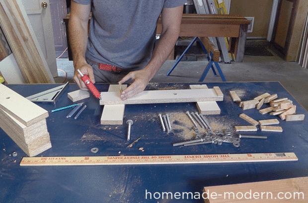Que sólo te dan un tiro en los pernos en la placa del bastidor por lo que es importante asegurarse de que los tornillos en las 3 tablas se alineen con la pared de apoyo. Corté trozos extras del tablero de la melamina en tiras del mismo ancho que los moldes y luego miden y perforaron los agujeros que podrían encajar los tornillos a través de. No quería que estas ayudas para tocar el concreto mojado así que pegué trozos pequeños de 1/2" madera contrachapada gruesa en los extremos para que le pase 1/2" por encima de la superficie del hormigón.