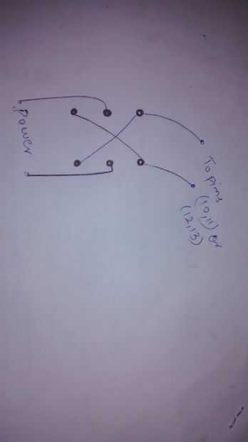 En dpdt encontrará un par de 3 conectores (si encuentras más algunos cortocircuitados internamente comprobar con un multímetro) unirse a ellos en figura con un cable rojo y negro. Después de hacerlo con ambos dpdt tienes cuatro cables de salida, conectar a los pines 10,11 (de un dpdt) y 12,13 (de otros dpdt) del ht12e.