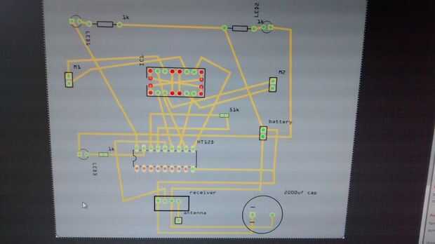 Coloque los componentes en la parte superior de la pcb y soldarlos en él, dos led en el frente para linterna, una led es para mostrar que se ha producido transmisión de datos entre emisor y receptor. Ver la imagen adjunta para el burg femenino components.4 en tiras en el frente son para el receptor, entonces tenemos las dos bases ic HT12D y el L293D (18 patillas y 16 bases de resp) .por los tres resistores de k resistencias dos 1 linterna LED y uno es 51k aprox. para pernos de oscilador de HT12D.solder los dos condensadores en paralelo para aumentar la red capacitancia (más la capacitancia mejor es).