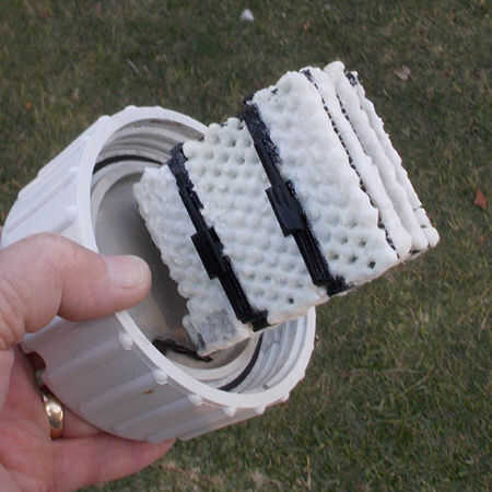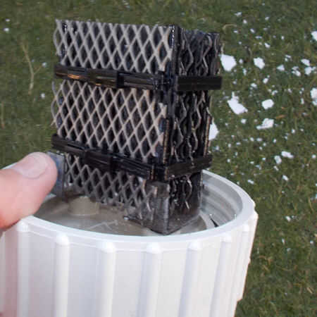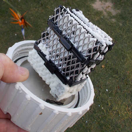 Ver foto arriba del clorador de sal tapado antes de ser rociado con arandela de presión, con el agua, y ajustar la presión que quería, el jet rápidamente corta los depósitos. La lavadora de presión quita los depósitos sin dañar los electrodos de cátodo y el ánodo.