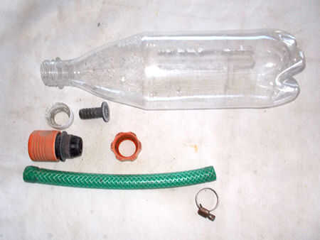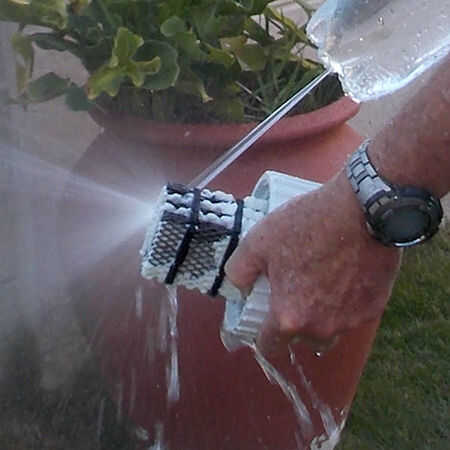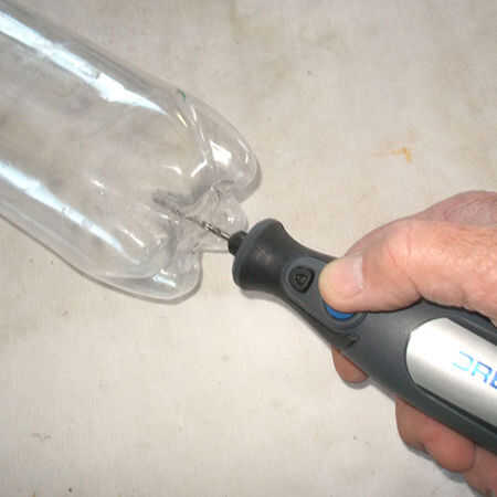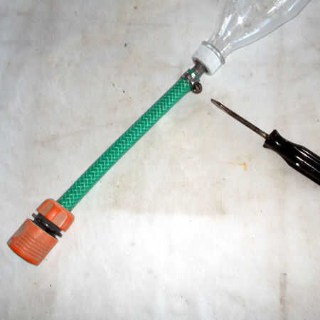 2. en el centro de la base de la botella (hay una sección pequeña y gruesa de los proceso de fabricación) Perfore un pequeño agujero. Perforé un orificio de diámetro 1,5 mm. Conectar la lavadora a su manguera de jardín y listo ir.
